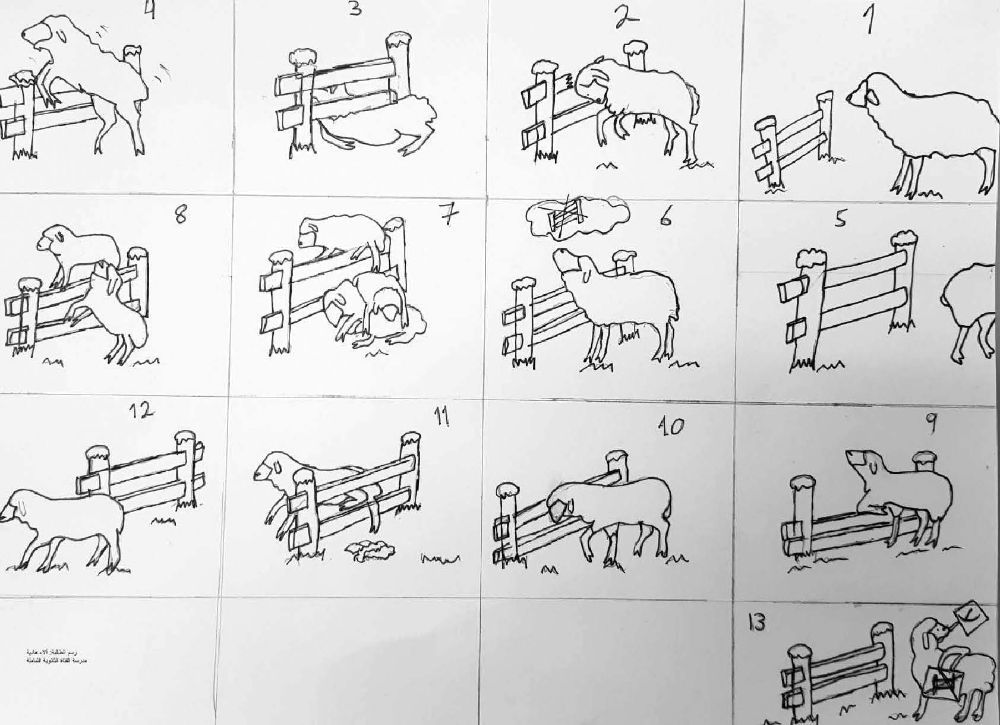 عندما يصل المراعي الكبيرة يقوم ببناء سياج يحيط بالخراف؛ لكي لا تهرب ليلا، ولكي يمنع الحيوانات الضّارية من الوصول إليها. حلم تلك الليلة أنّ ذئباً يهجم على خرافه فتهرب الخراف من الذئب وتعبر السياج الذي بناه حولها. لاحظ في منامه ظاهرة مثيرة وهي أن كلّ خروف كان يعبر السياج بطريقته الخاصة. أنظر الصورة.